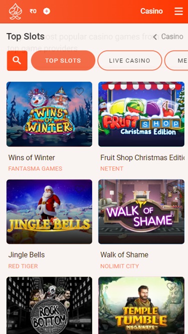 ギャンブル プラットフォームはインドの装飾で様式化されており、緑、オレンジ、紫のディテールが施された明るい背景、簡単なサインアップ手順、非常に整理されたゲーム カテゴリを備えています。