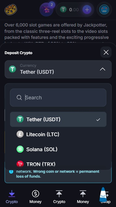 カジノのウォレットでは、暗号通貨、法定通貨の入出金、暗号通貨間のスワップが可能です。ADA 、BCH、BTC、DOGE、DOT、EOS、ETH、LTC、SOL、TON、TRX、TRY、USDC、USDT、XRPなどが取引可能な通貨です。