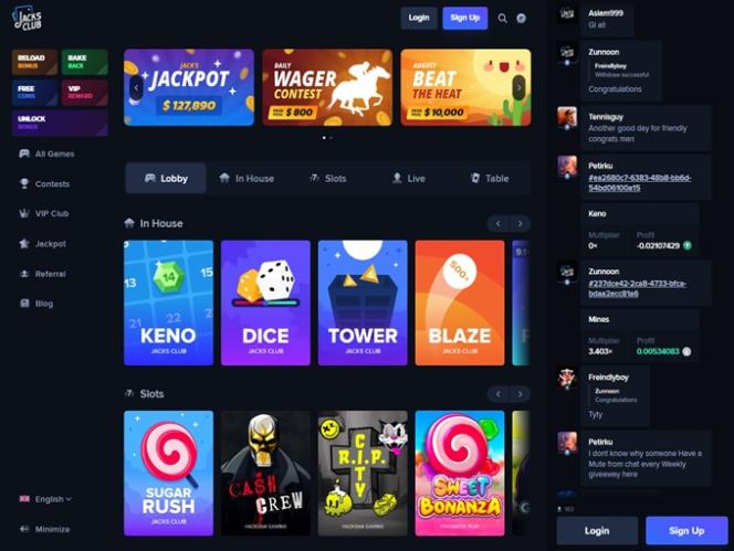 JacksClubは、ユーザーインターフェースを充実させるために、環境左側に縦型メニューを実装しました。プレイヤーはそこから、プロモーションプラン、VIPプログラム、イベント、ブログ、紹介プログラムなど、すべての情報にアクセスできます。さらに、ユーザーは英語とインドネシア語の閲覧言語を切り替えることができます。