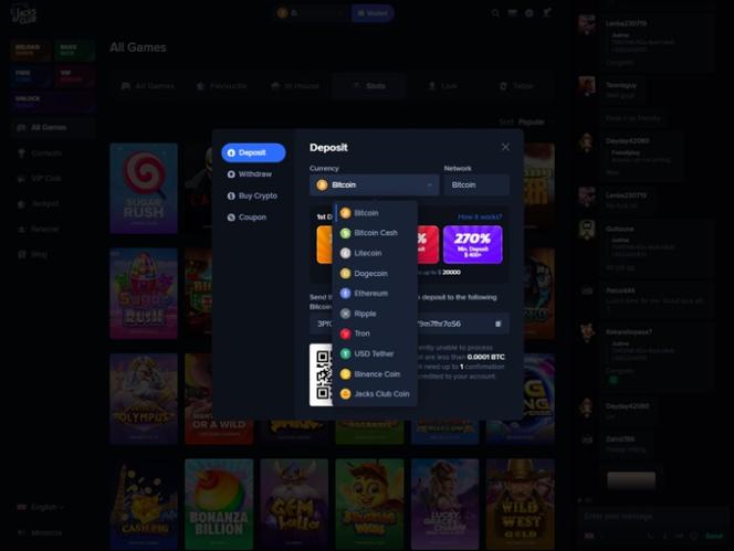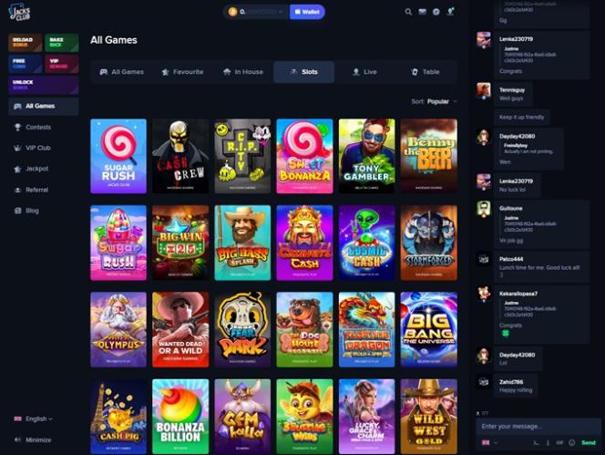 ページをさらに下にスクロールすると、主要カテゴリーの人気ゲームをすぐにご覧いただけます。中には、ここでしかプレイできない自社開発作品もいくつか含まれています。ウェブサイトに追加された魅力的な機能として、プラットフォーム右側にある専用チャットルームがあります。プレイヤー同士がヒントを共有したり、お互いを応援したり、あるいは日常の話題について話し合ったりして交流することができます。