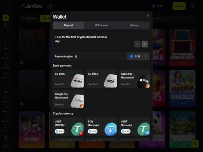 Jetton Casinoは、ゲームとスポーツベッティングの豊富なラインナップを誇る現代的なオンラインギャンブルサイトです。プレイヤーは、オンラインスロット、ライブディーラーゲーム、テーブルゲーム、インスタントウィンゲームなど、豊富なゲームライブラリをお楽しみいただけます。カザフスタン、ロシア、ウクライナ、ウズベキスタン、アゼルバイジャン、インドネシアのプレイヤーを歓迎し、魅力的なプロモーション、ボーナス、そして暗号通貨の取り扱いを提供しています。