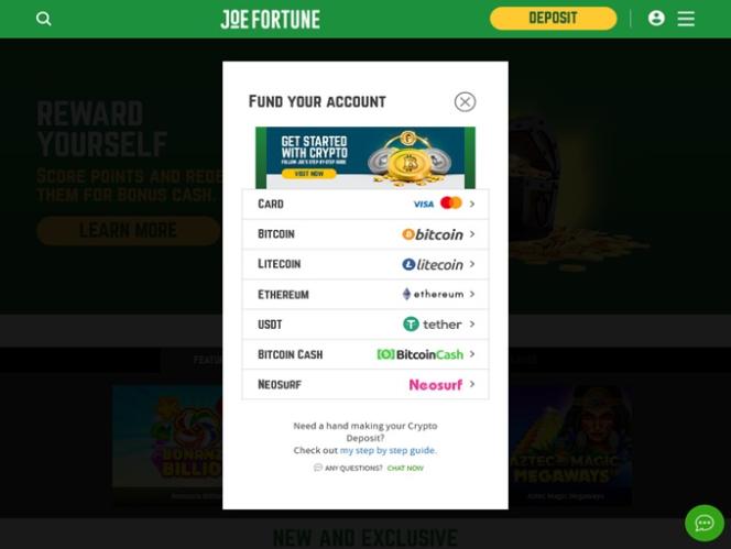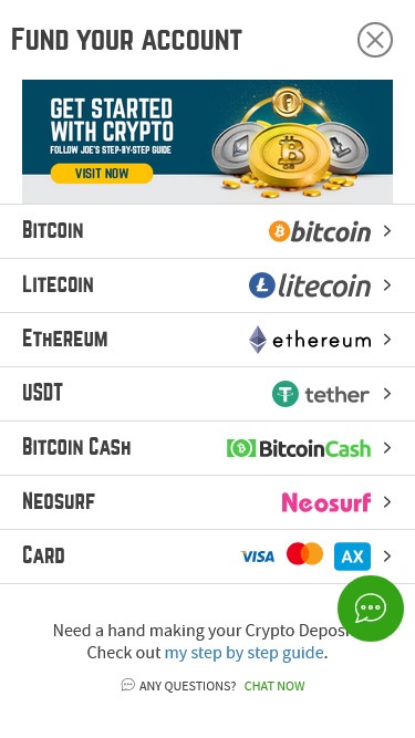 Joe Fortuneのバンキングシステムでは、Visa、MasterCard、Bitcoinによる入金と出金が可能です。入金はすべて即時処理され、出金はBitcoinが最も速く、その他の方法は少し時間がかかります。