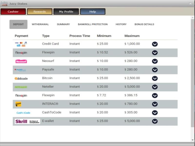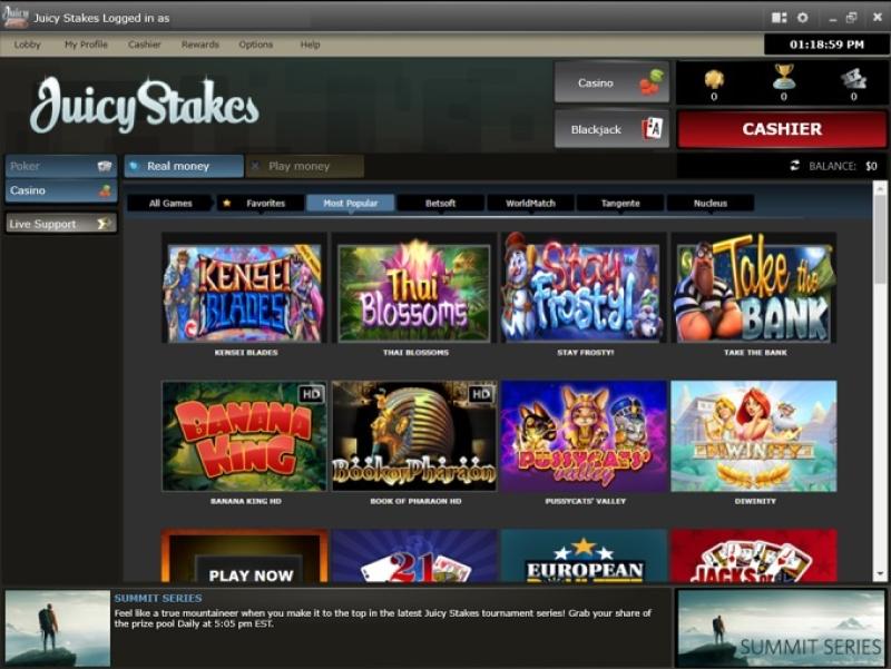 Juicy Stakes Casinoは BetSoft, WM and Nucleus Gamingを採用しており、ウェブベースのプラットフォームを通じてゲームを提供しています。カジノのポーカールームはウェブベースのプラットフォームを通じて提供されており、プレイするにはWindowsコンピューターが必要です。