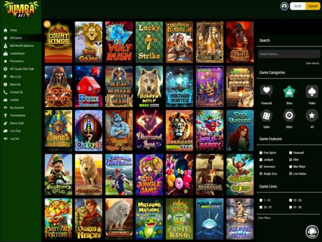 Jumba Bet Casinoは BetSoft, Evolution Gaming, Rival and Saucifyを採用しており、カジノのゲームはダウンロード可能なソフトウェアと、インターネットブラウザからプレイできるウェブベースのインスタントプレイプラットフォームの両方で提供されています。また、モバイルプレイにも対応しているため、スマートフォンやタブレットからプレイできます。その他のゲーム