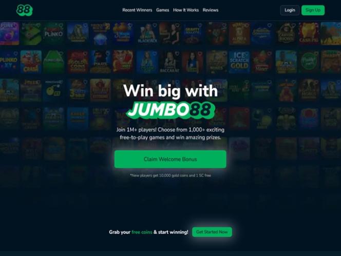 Jumbo88カジノは、エキサイティングな懸賞機能を備えた総合的なソーシャルゲームサイトです。米国(一部州による制限あり)のプレイヤー獲得に重点を置いています。オンラインスロット、クラッシュゲーム、テーブルゲーム、ライブディーラーなど、幅広いカジノスタイルのゲームを提供しています。プレイヤーは様々なプロモーション、ボーナス、ソーシャルメディアイベントに参加して、ゴールドコインや懸賞コインを獲得できます。