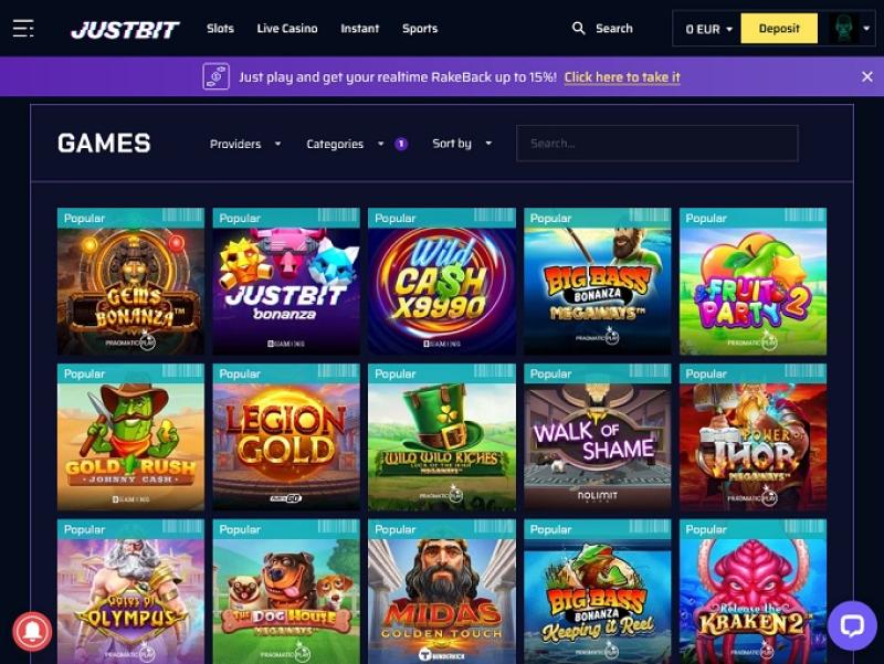 Justbit Crypto Casino でプレイすると、Gems Bonanza、Gaelic Golo、Big Bucks Bandits Megaways、Fire Strike 2、Legion Gold、Gates of Olympus、Book of Fallen、The Dog House Megaways など、数多くの伝説的なオンライン スロット タイトルをプレイできます。