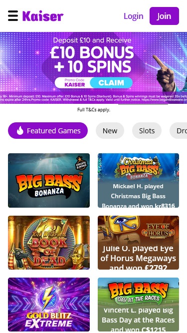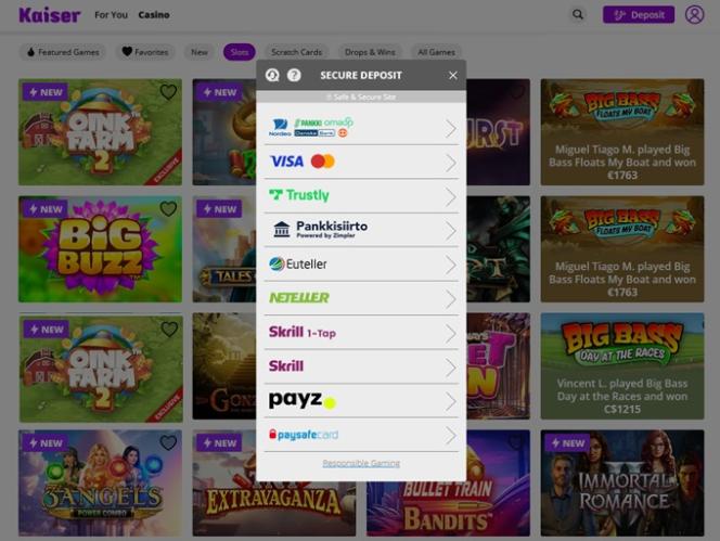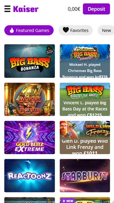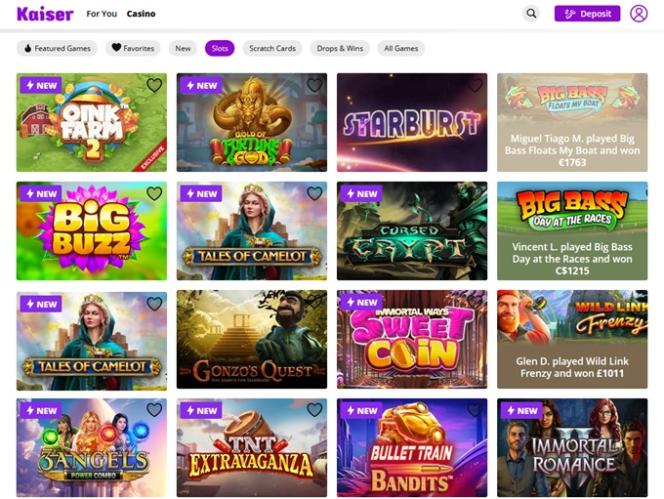 Kaiser Slotsは Microgaming, Net Entertainment, 1x2gaming, Big Time Gaming, EYECON, iSoftBet, lightningboxgames, Oryx, Play'n GO, playson, Quickspin, Wazdan, Realistic Games, Booming Games, Stakelogic, Pragmatic Play, Red Tiger Gaming, IGT, Spinomenal, Red Rake Gaming, Skillzzgaming, SYNOT Games, Skywind, Triple Edge Studios, Northern Lights Gaming, Stormcraft Studios, All41 Studios, Gameburger Studios, Pulse 8 Studios, Neon Valley Studios, SpinPlay Games, GONG Gaming, Buck Stakes Entertainment, Games Global, Wizard Games, Ainsworth, bluberi, Blueprint Gaming, Endemol Games, Greentube, NextGen, Pariplay, WMS, Inspired Gaming, Gaming Realms, SG Interactive, Scientific Games, Reel Time Gaming, betiXon, Bally Wulff, Iron Dog Studio, Foxium, Just For The Win, PearFiction Studios, Wild Streak Gaming, Slingshot Studios, Fortune Factory Studios, RubyPlay, Gamevy, Crazy Tooth Studio, Alchemy Gaming, Snowborn Games, Hacksaw Gaming, Gold Coin Studios, Slotmill, Aurum Signature Studios, Lucksome Gaming, Area Vegas, Wishbone Games, Spribe, HammerTime Games, INO Games, Nailed It! Games, Atomic Slot Lab, Neko Games, Reel Kingdom, Oros Gaming, Indigo Magic and Light & Wonderを採用しており、インターネットブラウザからアクセスできるウェブベースのプラットフォームでカジノを利用できます。カジノのデザインは美しく、操作も簡単で、プレイしたいゲームを見つけるのに苦労することはありませんでした。モバイルサポートも搭載されているため、スマートフォンやタブレットからギャンブルを楽しむことができます。Blackjack