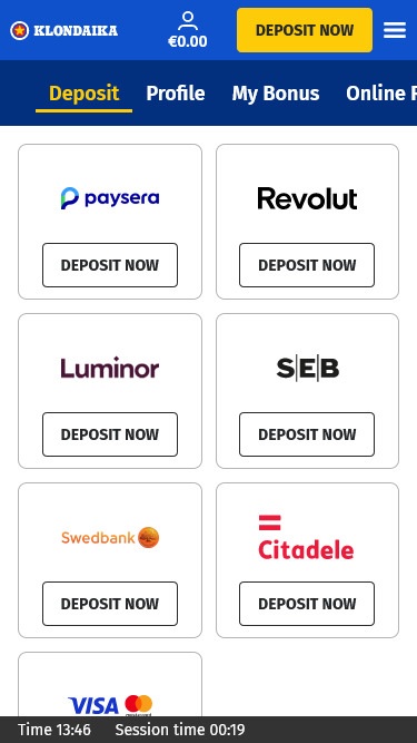 残念ながら、このレビューを書いている時点では、Klondaika では暗号通貨による支払いは利用できませんが、他の安全で人気の支払い方法は数多く提供されています。