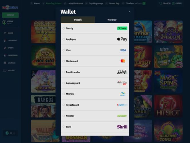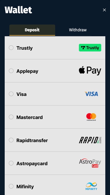 左側のメニューにある入金または残高ボタンをクリックすると、カジノ会員が利用できるさまざまな支払い方法が読み込まれます。