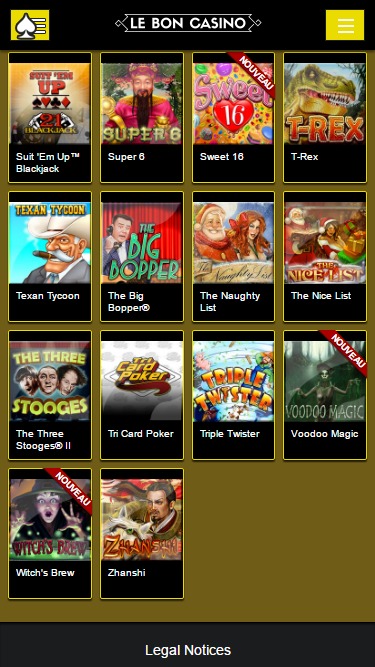 Le Bon Casinoは Real Time Gamingを採用しており、ゲームはウェブベースのプラットフォームを通じて提供されています。AndroidまたはiOSデバイスでプレイしたい方のために、モバイルサイトもご用意しています。