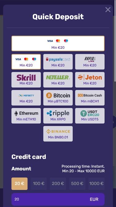 オペレーターは、ギャンブラーが入出金に利用できる、広く利用されている信頼性の高い決済方法をサポートしています。キャッシャーでは、従来型および暗号通貨に対応した様々な銀行決済オプションをご用意しており、出金にかかる時間も満足のいくものとなっています。