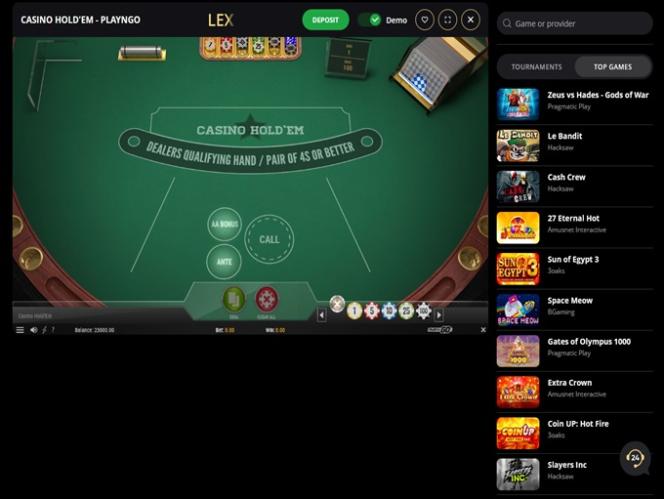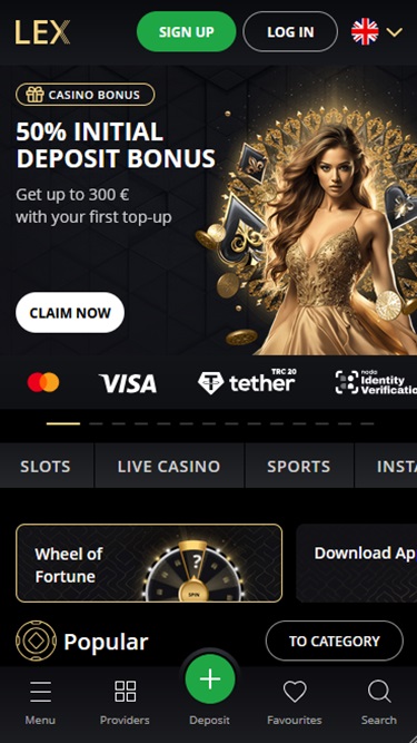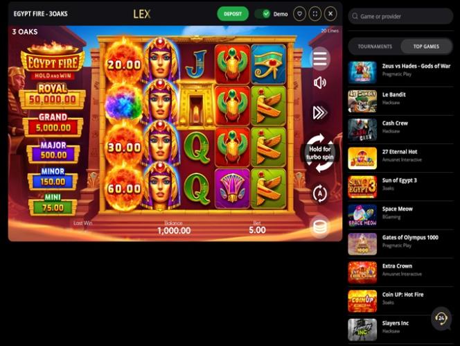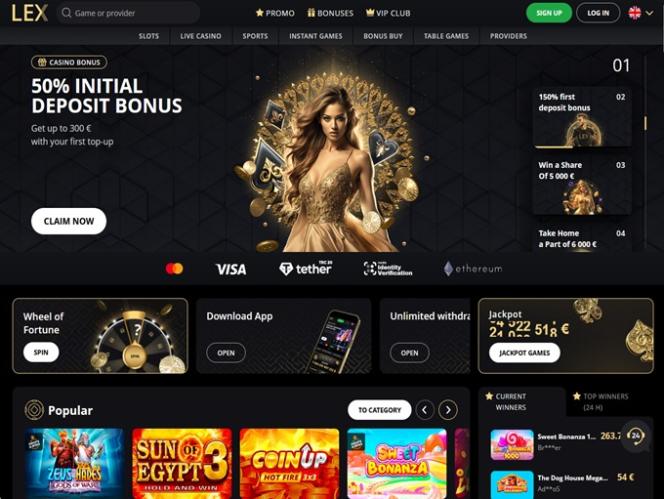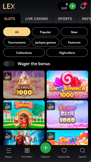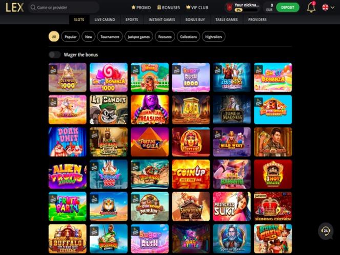 さらに、LEXカジノではウェブサイト上部に横長のメニューがあり、主要なギャンブルオプション、プロモーション、ボーナス、VIPクラブにすぐにアクセスできます。このメニューから、ウェブサイトの言語を英語、ロシア語、ドイツ語、ポルトガル語、スペイン語、フランス語に切り替えることもできます。