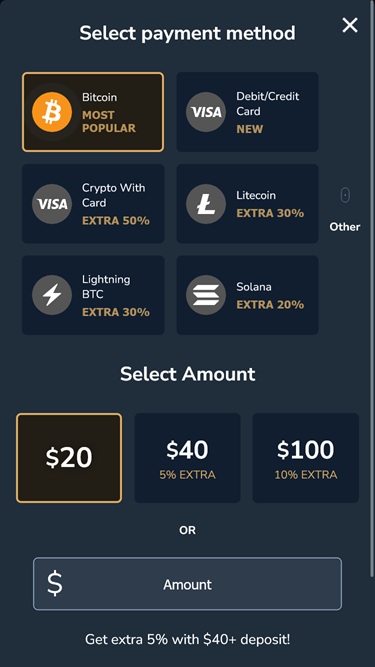 すでに述べたように、プレイヤーは好きな暗号通貨を選択し、入金と出金に使用できます。また、従来のカジノプレイヤーのために、このカジノでは決済カードも利用可能であることも忘れてはなりません。