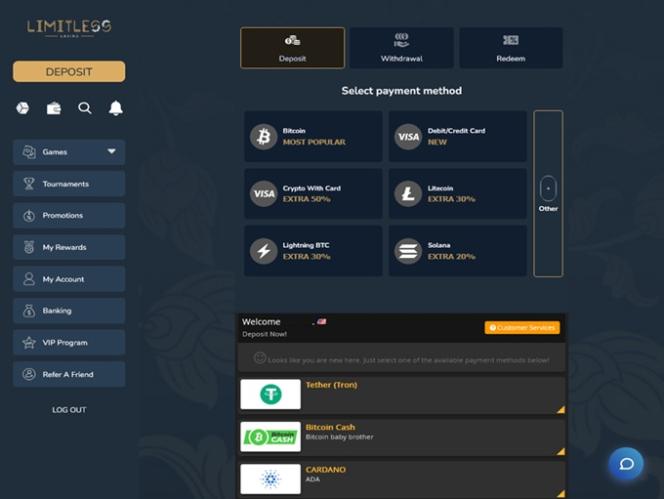 Limitless Casino は米国に拠点を置く小規模なゲームブランドですが、このサイトで利用できる暗号通貨の支払いオプションは数多く、非常に印象的です。