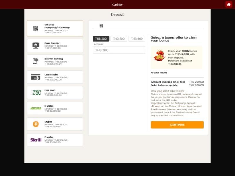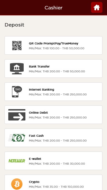 ライブカジノのバンキングシステムは、即時銀行振込とダイレクトバンキングを採用しています。カジノ側は即時銀行振込によるほぼ即時の出金を謳っていますが、出金限度額は週5,000ドルです。もう少し選択肢があれば良いのですが、アジアにおけるギャンブル取引に関する規制を考えると、仕方がないかもしれません。