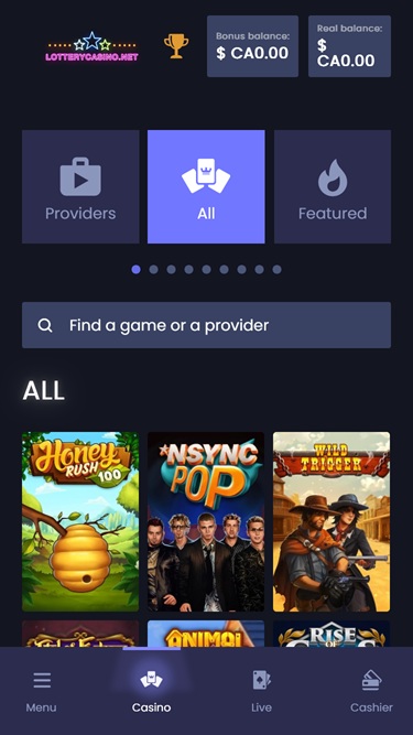 Lottery Casino は Microgaming, Net Entertainment, Playtech, 1x2gaming, Barcrest, Big Time Gaming, ELK Studios, Evolution Gaming, EYECON, Ezugi, lightningboxgames, Play'n GO, Rabcat, Rival, Saucify, Thunderkick, PlayPearls, Nolimit City, Red Tiger Gaming, Spinomenal, Skillzzgaming, Kalamba, Skywind, Triple Edge Studios, Northern Lights Gaming, Stormcraft Studios, Switch Studios, All41 Studios, Gluck Games, Gameburger Studios, Pulse 8 Studios, Slot Factory, Neon Valley Studios, Shuffle Master, SpinPlay Games, GONG Gaming, Buck Stakes Entertainment, Games Global, 2by2 Gaming, Blueprint Gaming, Games Warehouse, NextGen, Tom Horn Gaming, WMS, Inspired Gaming, Genii, SG Interactive, Red7Mobile, Scientific Games, Iron Dog Studio, Old Skool Studios, Foxium, Just For The Win, PearFiction Studios, Slingshot Studios, Fortune Factory Studios, Gamevy, Crazy Tooth Studio, Groove Gaming, ReelPlay, Alchemy Gaming, Black Pudding Games, Snowborn Games, Hacksaw Gaming, Gold Coin Studios, Half Pixel Studios, Eurostar Studios, Aurum Signature Studios and Lucksome Gamingによって運営されており、そのゲームは Web ベースのインスタント プレイ プラットフォームを通じて提供されます。Blackjack