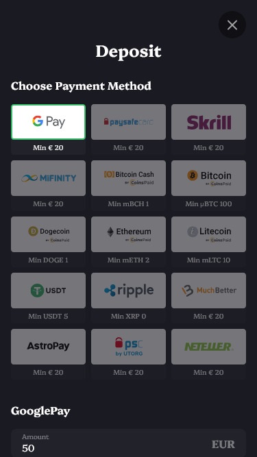 このカジノブランドは、 Visa 、 Mastercard 、 Skrill 、 Neteller 、 MiFinity 、 Paysafecard 、 Jeton 、 Google Payなど、様々な銀行決済オプションを利用してプレイヤーが入出金できるという、決済アクセスに関する現代的なアプローチを採用しています。また、ビットコイン、ビットコインキャッシュ、イーサリアム、ドージコイン、リップル、テザー、ライトコイン、カルダノなどの暗号通貨もご利用いただけます。