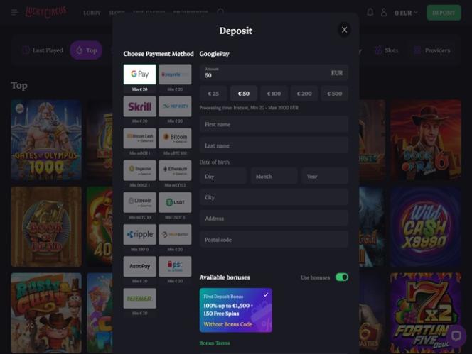 - Lucky Circus Casino では、支払い方法として法定通貨と暗号通貨の両方が受け入れられます。
