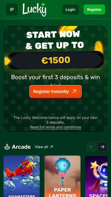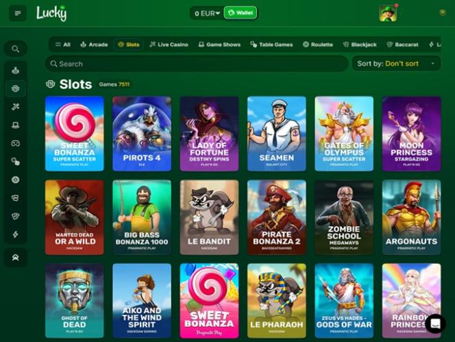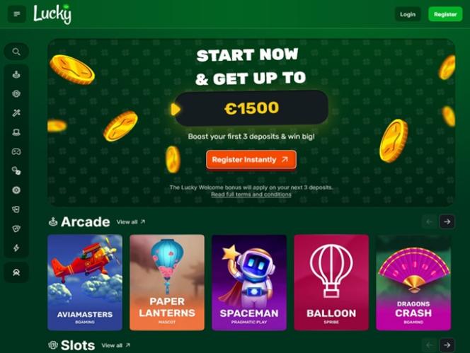 Lucky.coは、カナダ、ドイツ、オーストリア、アイルランド、ニュージーランドのプレイヤーをウェブサイトに招待するオンラインカジノです。リアルマネースロット、ライブディーラー、テーブルゲーム、インスタントクラッシュゲームなど、豊富なカジノゲームラインナップを提供しています。このブランドは幅広い優れたオプションを提供しており、プレイヤーは魅力的なウェルカムボーナスと紹介プログラムも利用できます。