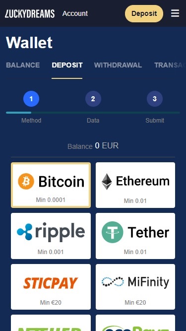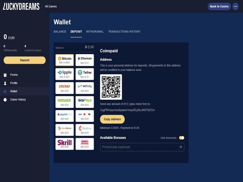LuckyDreamsは、プレイヤーに様々な仮想通貨バンキングソリューションを提供する、最新の仮想通貨対応オンラインカジノブランドの一つです。従来のプレイヤーは、クレジットカード、電子ウォレット、銀行振込といったより標準的な決済方法をご利用いただけます。これらの決済オプションはすべて手数料無料です。