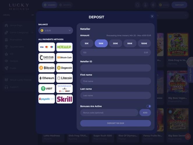 Lucky Friendsは、様々なロイヤルティ特典に加え、プレイヤーを飽きさせない豊富なプロモーションやボーナスも提供しています。アカウントを作成すると、入金金額に応じたボーナスが複数提供される、豪華なウェルカムパッケージを受け取ることができます。