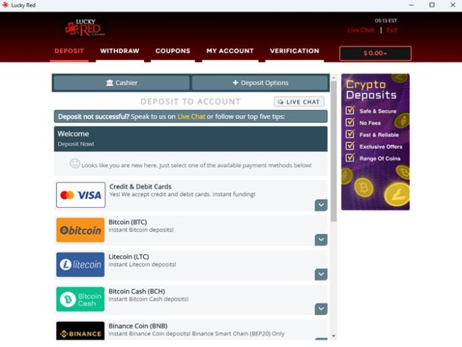 Lucky Red Casinoへの入金はクレジットカードとeWalletで、出金はクレジットカード、銀行振込、eWallet、小切手で可能です。出金にかかる時間は適切で、Lucky Redの経営陣は適切な時間内に出金を完了してきた実績があります。