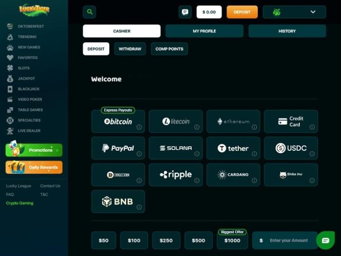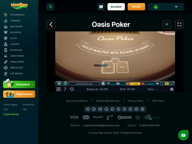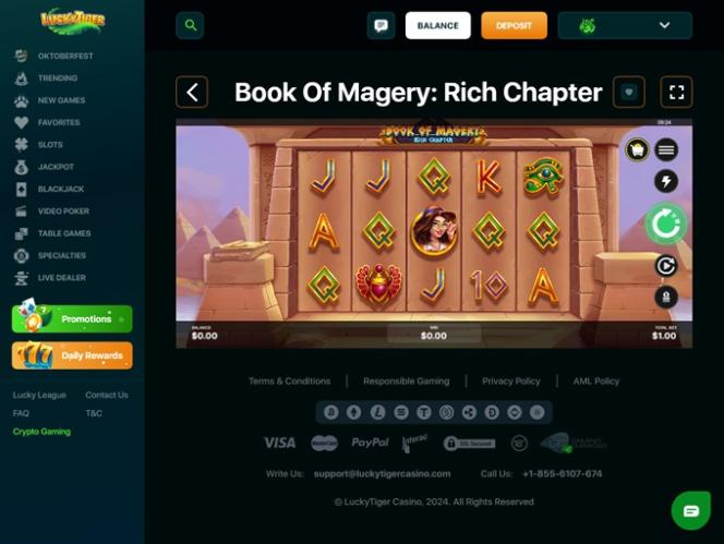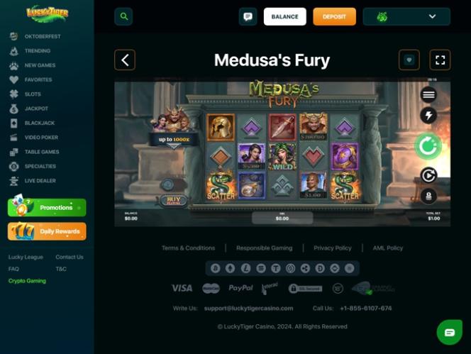 Lucky Tiger Casinoは BetSoft, Rival, Saucify, Visionary iGaming, Betgames, Nucleus Gaming, Spadegaming, BGAMING, Genii, Wager Gaming, Dragon Gaming, FastSpin, Dragoon Soft and Urgent Gamesを採用しており、カジノのゲームはサイトのウェブベースのプラットフォームを通じて提供されています。つまり、ソフトウェアをダウンロードする必要はなく、パソコンのウェブブラウザだけでプレイできます。モバイルサポートも搭載されているため、スマートフォンやタブレットでもプレイできます。その他のゲーム