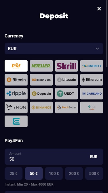 カジノキャッシャーでは豊富な決済オプションをご用意しており、プレイヤーは暗号通貨を含む、様々な人気で信頼性の高い決済方法をご利用いただけます。Neteller やSkrillなどの有名な電子ウォレットやオンライン決済システム、即時銀行振込、その他の入出金オプションもご利用いただけます。
