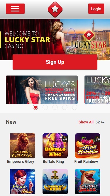 Lucky Star Casinoは Microgaming, Net Entertainment, Playtech, BetSoft, Amatic Industries, Big Time Gaming, ELK Studios, Espresso Games, Evolution Gaming, Ezugi, Habanero Systems, iSoftBet, Novomatic, Play'n GO, playson, Quickspin, Rabcat, Relax Gaming, Thunderkick, Vivo Gaming, Yggdrasil, Endorphina, Wazdan, GameArt, Betgames, Booming Games, Stakelogic, Pragmatic Play, Nolimit City, Felt Gaming, Red Tiger Gaming, Booongo, Spinomenal, Felix Gaming, Red Rake Gaming, Fugaso, SYNOT Games, Kalamba, Revolver Gaming, Skywind, Triple Edge Studios, Northern Lights Gaming, Fazi, Evoplay, Stormcraft Studios, IGTech, Switch Studios, OneTouch, Bulletproof Games, All41 Studios, Gluck Games, Mascot Gaming, Gameburger Studios, Pulse 8 Studios, Slot Factory, Neon Valley Studios, Golden Rock Studios, SpinPlay Games, GONG Gaming, On Air Entertainment, Buck Stakes Entertainment, Caleta Gaming, Elysium Studios, UP Games, Games Global, Reevo, Amusnet Interactive, Ash Gaming, Blueprint Gaming, CT Interactive, Greentube, Merkur Gaming, ProWager Systems, Push Gaming, Tom Horn Gaming, Mr Slotty, Reel Time Gaming, betiXon, Iron Dog Studio, Old Skool Studios, Foxium, Just For The Win, Reflex Gaming, PearFiction Studios, Wild Streak Gaming, Slingshot Studios, Fortune Factory Studios, AvatarUX, Gamevy, Crazy Tooth Studio, ReelPlay, Alchemy Gaming, Rarestone Gaming, Vibra Gaming, BB Games, Snowborn Games, Boomerang Studios, Hacksaw Gaming, Max Win Gaming, Gold Coin Studios, Bang Bang Games, Gamzix, Half Pixel Studios, Arcadem, Slotmill, Dragon Gaming, Peter And Sons, Eurostar Studios, Lucksome Gaming, Dragoon Soft, Kiron, 3 Oaks Gaming, Amigo Gaming, Wishbone Games, LiveG24, Spribe, Circular Arrow, Print Studios, Elbet, HammerTime Games, INO Games, Nailed It! Games, Neko Games, Reel Kingdom, Oros Gaming and PlayAceを採用しており、ゲームはウェブベースのインスタントプレイプラットフォームを通じて提供されています。つまり、登録、入金、プレイ、出金はすべてインターネットブラウザから直接行うことができ、プレイヤーはソフトウェアをダウンロードする必要はありません。モバイルサポートも提供されており、スマートフォンやタブレットから入出金が可能です。