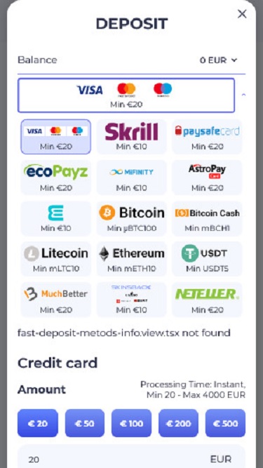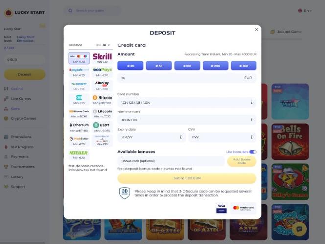 LuckyStartカジノで人気の決済方法は、Visa、MasterCard、Skrill、Neteller、ecoPayz、 Neosurf 、Jetonです。他にも多くの選択肢があり、暗号通貨を使った入出金も可能です。