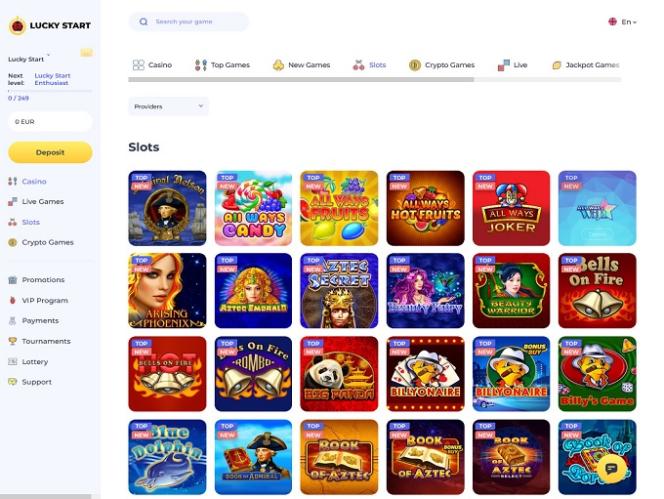 LuckyStart カジノでは実にさまざまなオンライン スロットが提供されています。プレイヤーに最も人気のあるタイトルには、All Ways Candy、Bells on Fire、Aztec Emerlad、Billy's Game、Big Panda、Book of Aztec、Book of Admiral、Arising Phoenix などがあります。