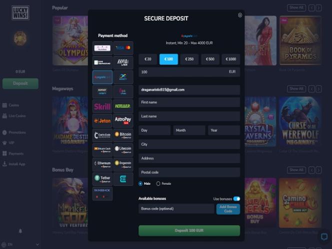 LuckyWins Casinoは、プレイヤーが入出金に利用できる幅広い決済オプションを豊富に取り揃えており、私たちにとって大きな強みとなっています。人気の決済方法には、Skrill、 Neteller、 Visa、Mastercard、Neosurf、Paysafecardなどがあります。また、仮想通貨での入金をご希望の方には、ビットコイン、イーサリアム、ライトコイン、ドージコイン、テザーといった仮想通貨が簡単に利用できることをご安心ください。