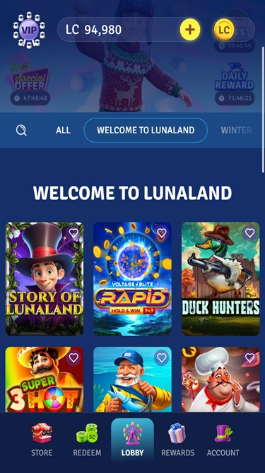 現代のスウィープスカジノに期待されるように、LunaLandはプレイヤーの皆様にお楽しみいただける魅力的なプロモーションとボーナスを豊富に取り揃えています。まず第一に、新規アカウントを開設された方は全員、無料のスウィープスコインとルナコインを含む豪華なウェルカムパッケージを受け取ることができます。