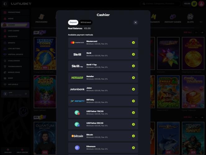 Lunubetカジノは、世界中のプレイヤーのニーズに応えるため、従来型決済と暗号通貨決済の両方を幅広く取り揃えています。暗号通貨にご興味のある方は、 BTC、DOGE、ETH、LTC、SOL、TRX、USDC、USDTなどをご利用いただけます。