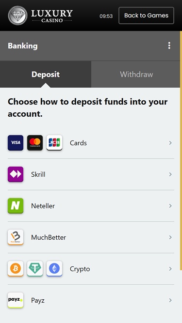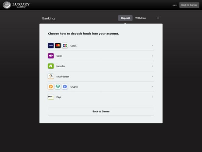 Luxury Casinoの銀行システムは良く、クレジットカード、デビットカード、e-Wallets、銀行間の電子送金、Paysafecardなどを提供するサイトを含んでいます。引き出しはチェック、電子送金、eWalletを介して行われます。引き出しにかかる時間は、顧客が選ぶ引き出し方法によって異なります。