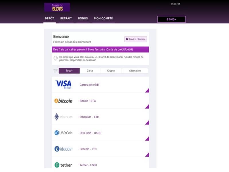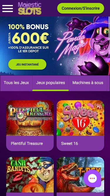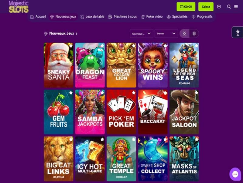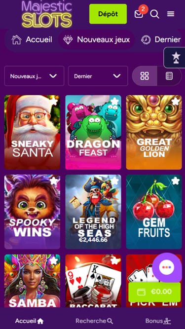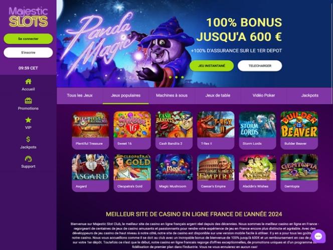 Majestic Slots Casinoは、2012年に設立され、フランスの賭博市場に特化したオンライン賭博サイトです。華やかな雰囲気のカジノで、充実したゲームラインナップ、迅速な出金時間、そして優れたカスタマーサポートを提供しており、プレイするのに最適なサイトとなっています。