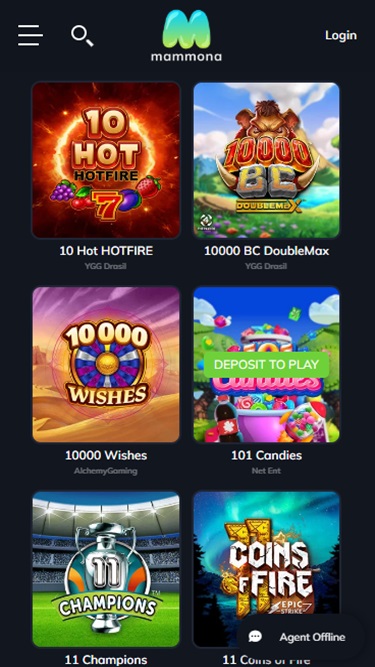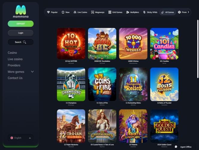 Mammonaでは、ウェブサイトの左側に縦長のメニューを配置し、閲覧を容易にしています。ここから、すべてのゲームカテゴリー、サブカテゴリー、ソフトウェアプロバイダーに簡単にアクセスできます。このミニマリストな環境は、プレイヤーとして必要なものをすべて備えており、無駄な情報で煩わされることはありません。