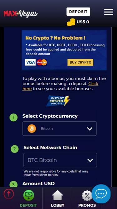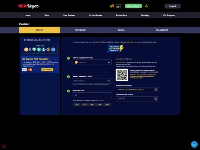 Max Vegasカジノは、プレイヤーが入金・出金に様々な暗号通貨を利用できるようにしています。 ビットコイン、ビットコインキャッシュ、テザー、イーサリアム、ライトコイン、USDコイン、バイナンスコインなど、様々な暗号通貨をご利用いただけます。