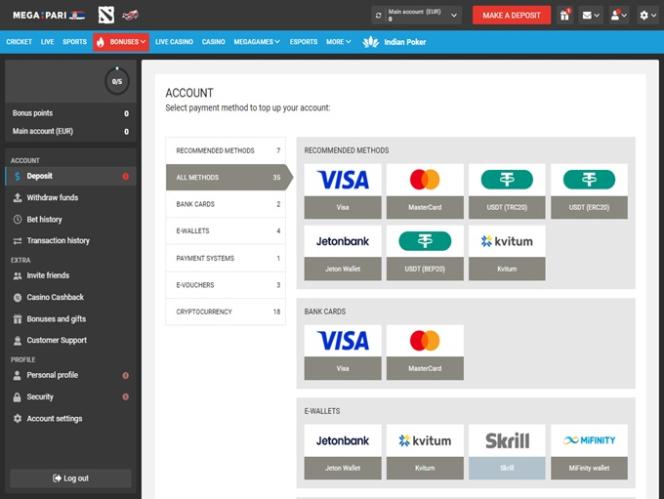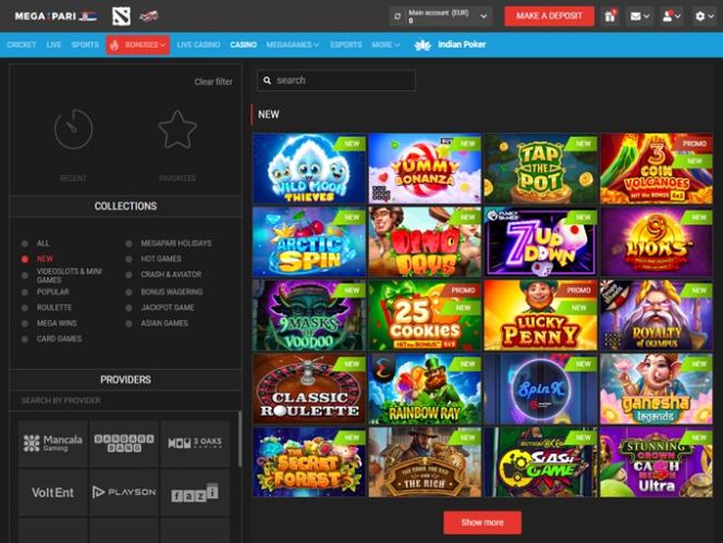 標準的なカジノに加えて、Megapari は顧客にフル スポーツブック、e スポーツブック、ライブ ディーラー カジノ、ポーカー ルーム、ビンゴ ルームを提供しています。