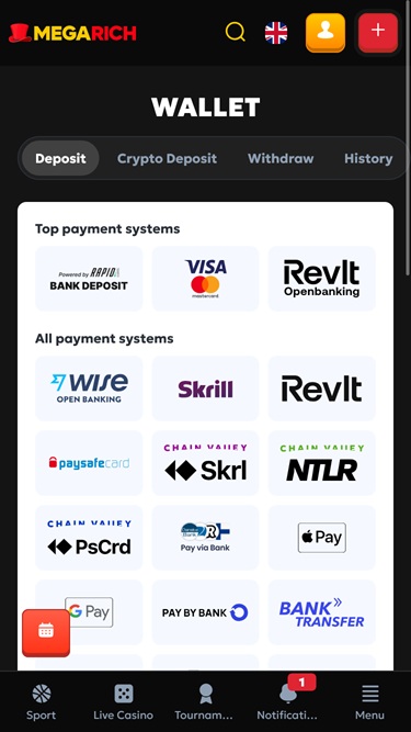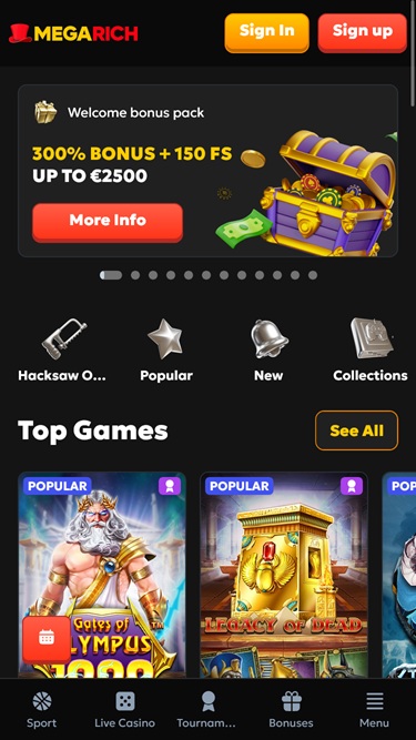Megarichは、キュラソーのライセンスに基づいて運営されている、仮想通貨対応のオンラインカジノです。ブラックジャック、ポーカー、ルーレット、バカラ、ライブカジノゲームなど、幅広いカジノゲームを誇ります。