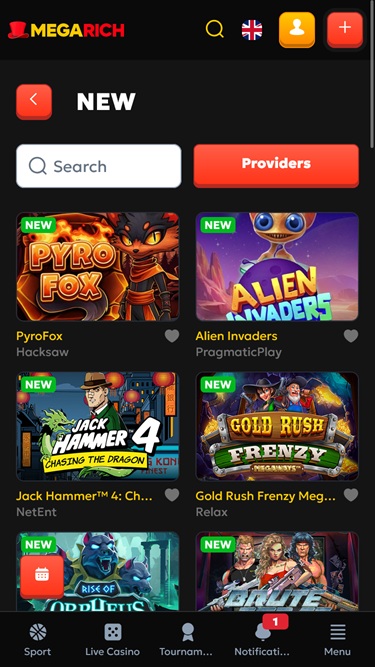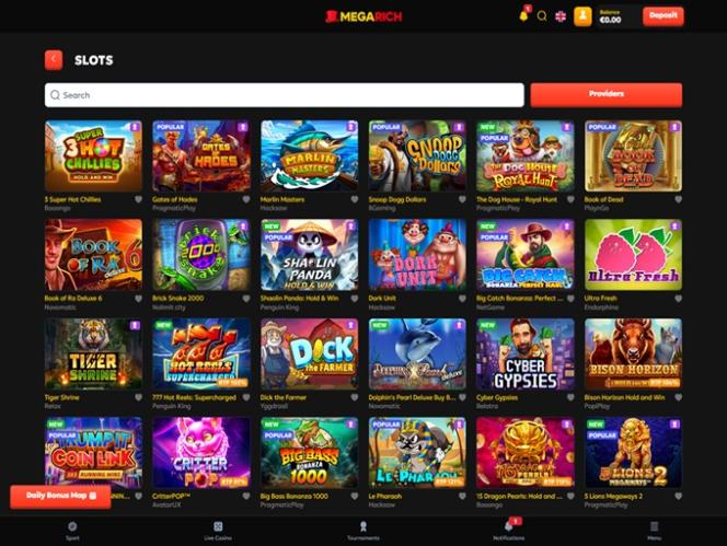 前述の通り、Megarichカジノは様々な有名プロバイダーによる多様なスロットを提供しています。Amusnet Interactive、Spinomenal、 Betsoft 、Quickspin、Evoplay Entertainment、 Red Tiger Gaming 、Stakelogic、Play'n GOなど、数々の有名プロバイダーのゲームをお楽しみいただけます。