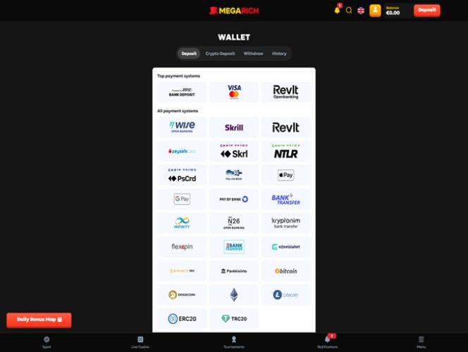 先ほども述べたように、Megarichカジノでは暗号通貨も有効な決済方法としてご利用いただけます。つまり、 Visa 、Mastercard、Skrill、Netellerといった一般的な決済方法に加え、ビットコイン、イーサリアム、ライトコイン、ドージコインといった仮想通貨もご利用いただけます。