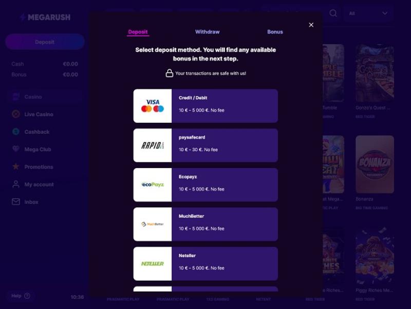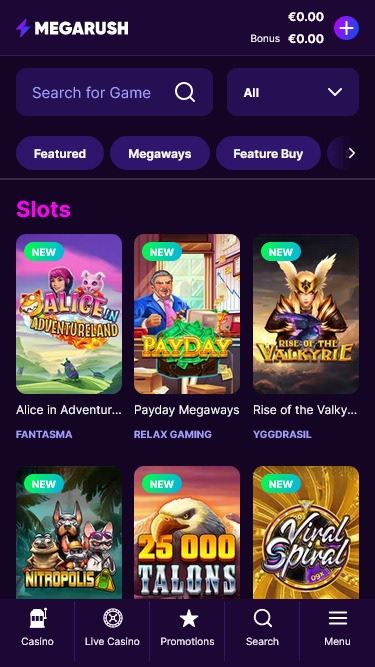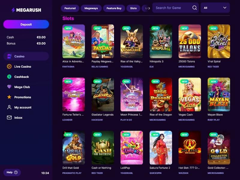 MegaRush には、3,000 を超えるタイトルを揃えた素晴らしいスロット ゲーム ライブラリがあります: Wheel of Wishes、Book of Dead、Juicy Joker Mega Moolah、Vampire Hunters、Starburst、Bigger Bass Bonanza、Arabian Nights、Chinese New Year、Hot Burning Wins、Royal Mint、Congo Bongo、Sparkling Fresh、Hall of Gods、Prosperity Pearls Hold the Jackpot、Bloopers、Mystery Museum、Divine Fortune、Lucky Halloween、Mega Moolah、Eastern Gold Deluxe、Book of Atem WowPot、4 Diamond Blues Megaways、Wild Chapo、Cherry Blast、Major Millions...