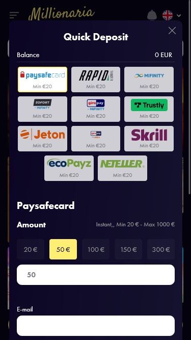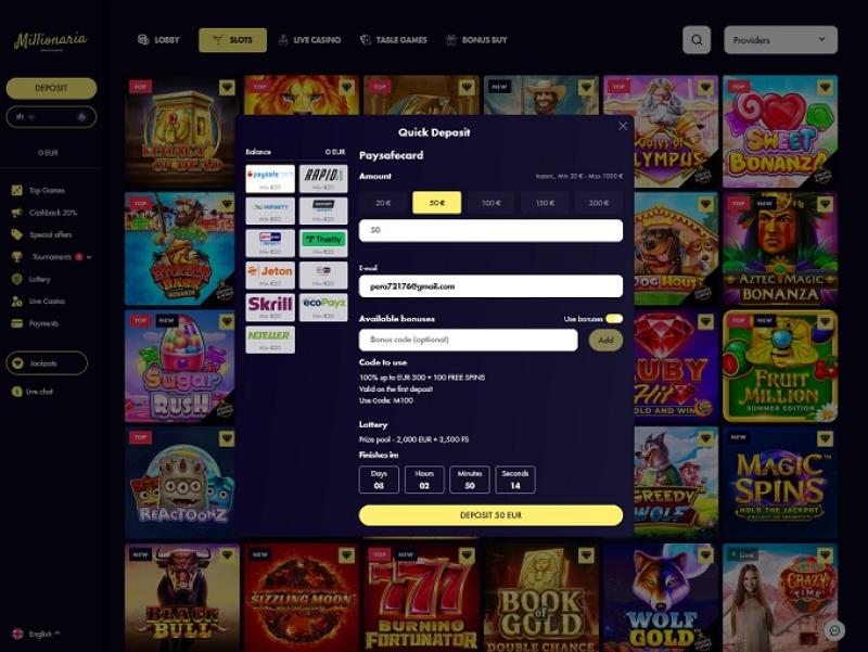 Milionariaの「ウォレット」には、様々な支払い方法が用意されています。プレイヤーは、決済カード、各種電子ウォレット、バウチャーを使用してアカウントに資金を入金したり、賞金を出金したりできます。