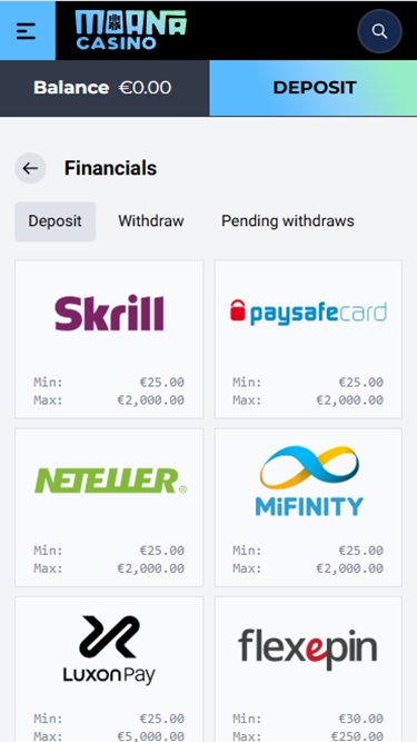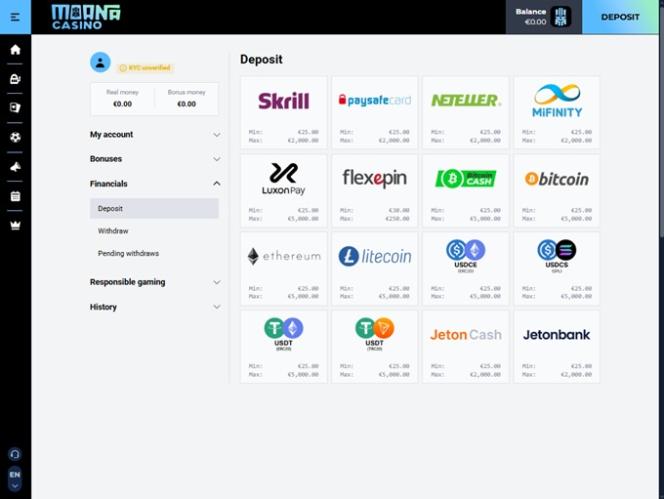 支払い方法については、銀行振込、 Google Pay 、 Apple Pay 、 Skrill 、 Neteller 、 Paysafecard 、 MiFinity 、 Neosurfなど、複数の決済方法をご利用いただけます。また、ビットコイン、ビットコインキャッシュ、イーサリアム、ライトコイン、テザー、 USDコインなどの暗号通貨で資金を管理できます。