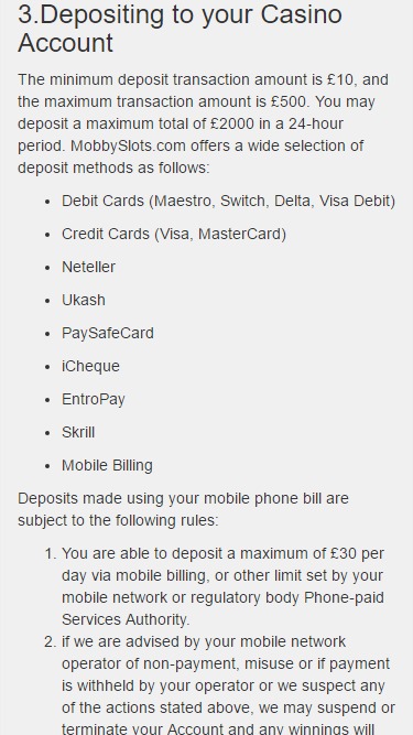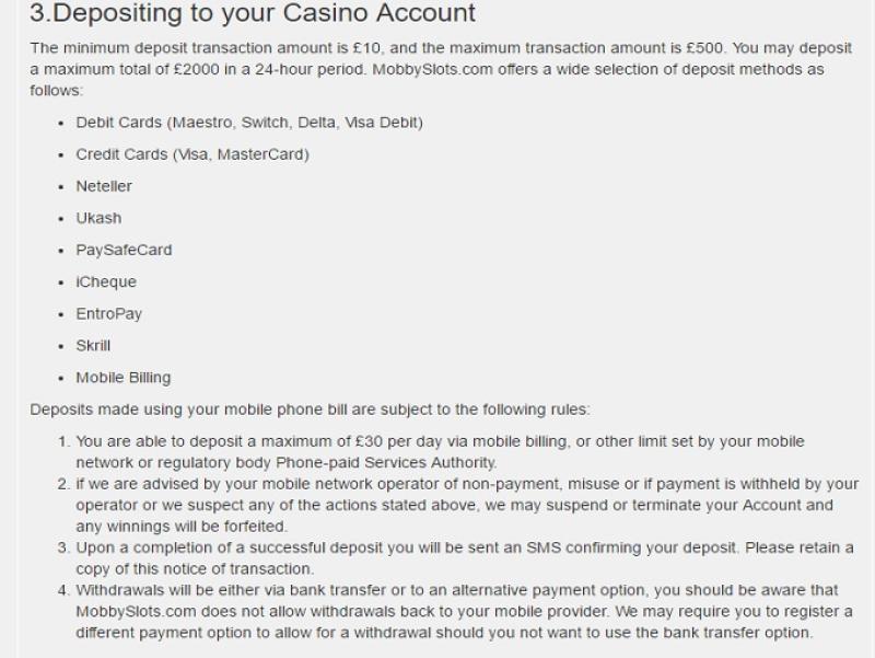 MobbySlots Casinoのバンキングシステムは非常に優れており、出金は即日処理されます。銀行振込、EntroPay、Maestro、MasterCard、Skrill、Neteller、Paysafecard、Visaによる入金と出金が可能です。賞金の出金制限がないのも嬉しいポイントです。