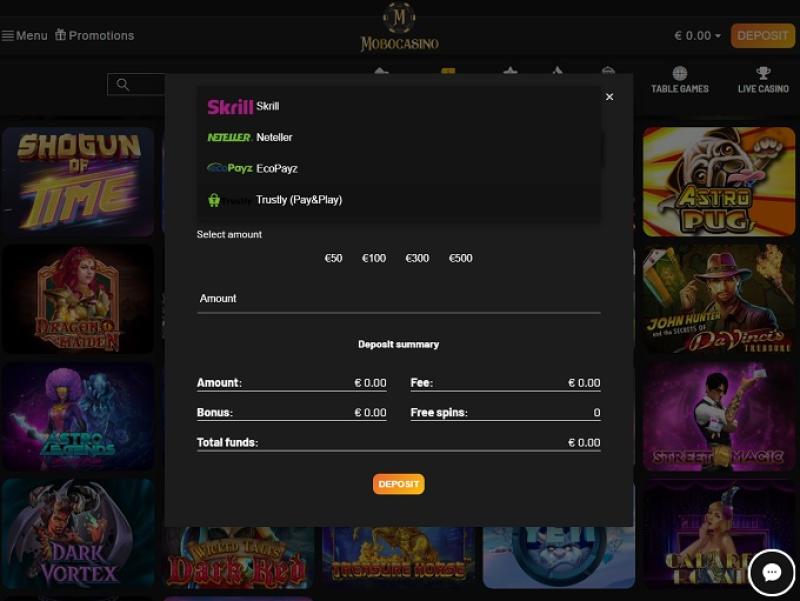 MoboCasinoの銀行オプションは充実しており、Visa、MasterCard、Neteller、Skrill、Paysafe Cardによる入金・出金が可能です。カジノへの入金は即時処理され、出金は選択した方法に応じて約3~7営業日で処理されます。