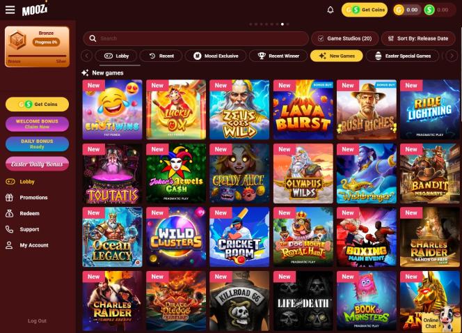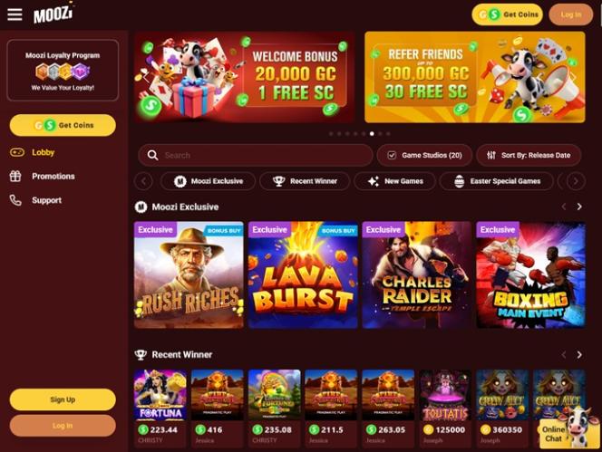 2024年に設立されたMoozi Casinoは、一部の州を除き、主に米国ユーザーを対象としたソーシャルカジノです。このブランドは、数百ものカジノスタイルのオンラインスロット、クラッシュゲーム、限定ゲームなど、充実したゲームカタログを誇ります。プレイヤーは数々のボーナスやプロモーションを楽しんだり、様々なイベントに参加してゴールドコインやスウィープコインを無料で獲得できます。