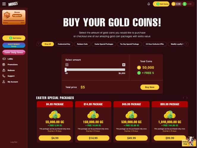 Moozi Casinoでアカウントを作成すると、滞在中に楽しめる数々のボーナスやプロモーションをお楽しみいただけます。まず、初心者プレイヤーには、無料のゴールドコインとスイープコインが付与される、お得なウェルカムボーナスをご用意しています。これにより、大きなアドバンテージを得て、ゲームを有利に進めることができます。