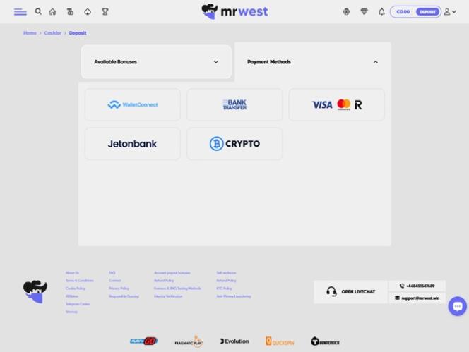 ロイヤルティプログラムに関する情報は必ずしも全て網羅しているわけではありませんが、MrWest Casinoの標準的なプロモーションプランは、プレイヤーの体験を次のレベルへと引き上げる数々のボーナスが用意されており、大変満足できる内容となっています。利用できる追加コンテンツも豊富で、カジノが提供する特典にきっとご満足いただけるはずです。